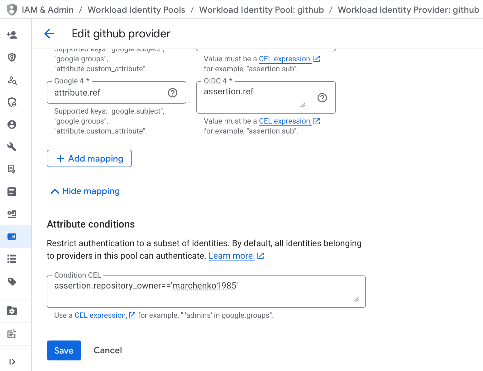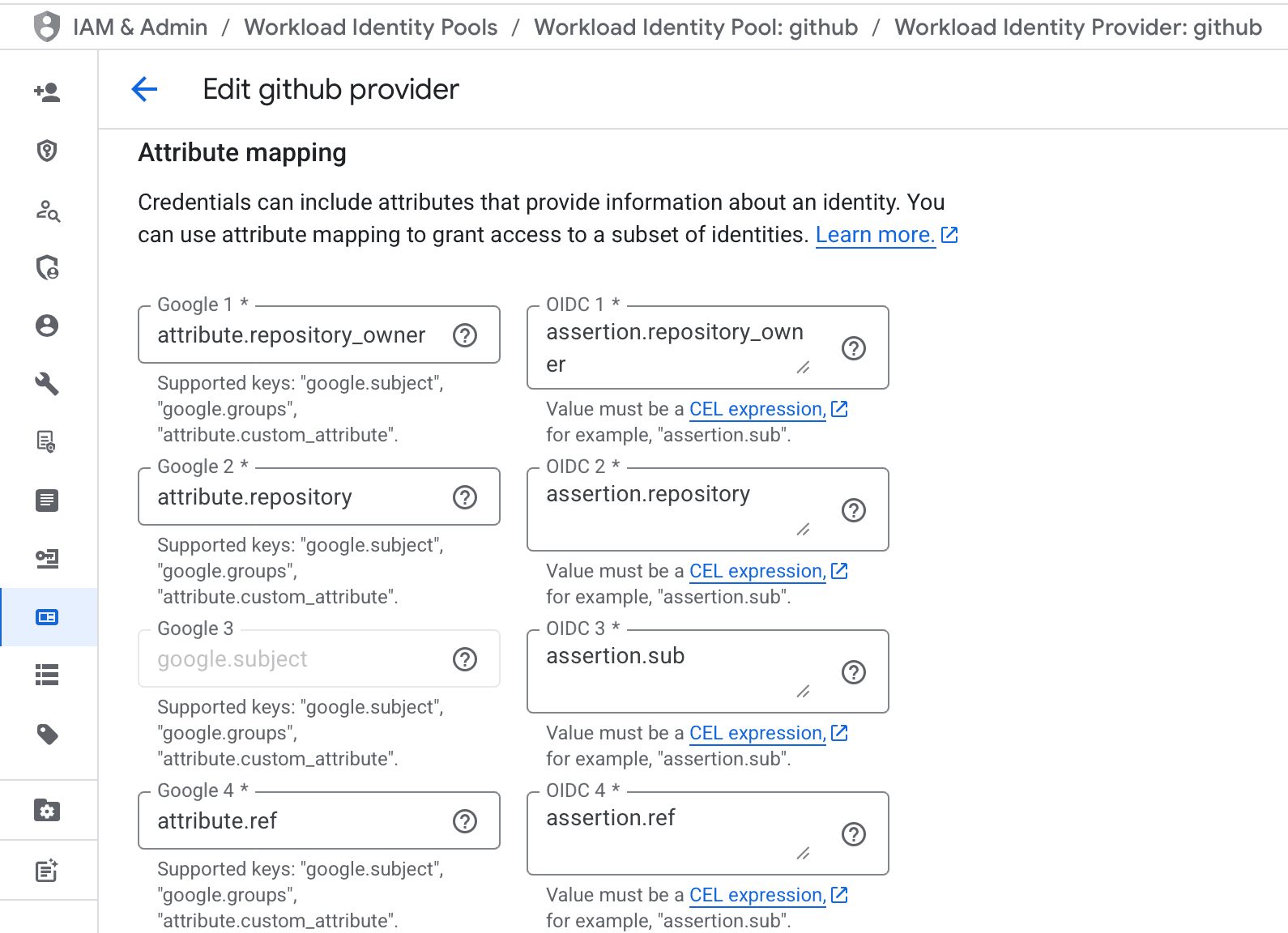 issuerUriishttps://token.actions.githubusercontent.comattributeMappingcontainsgoogle.subject,attribute.repositoryandattribute.ref- seems like that is required minimum, in our case, i wanted wider access so also addedrepository_ownerattributeConditionis set, and is using attributes that appear inattributeMapping