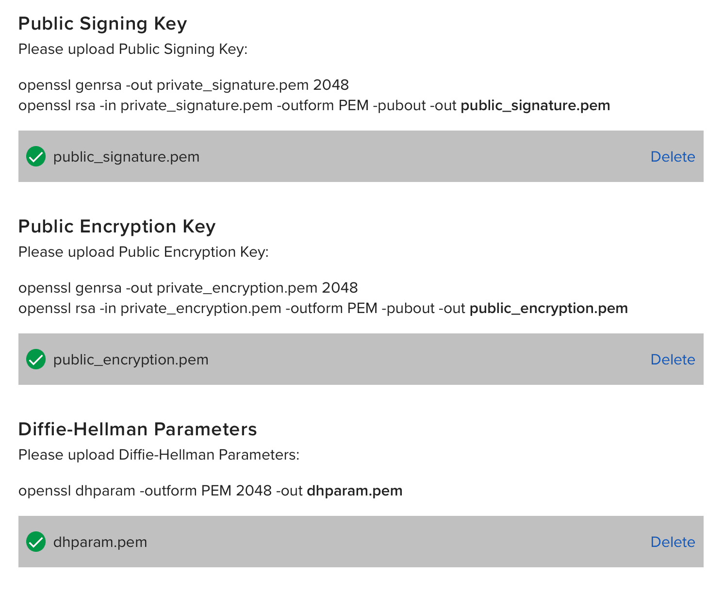 Upload public_signature.pem, public_encryption.pem and dhparam.pem
