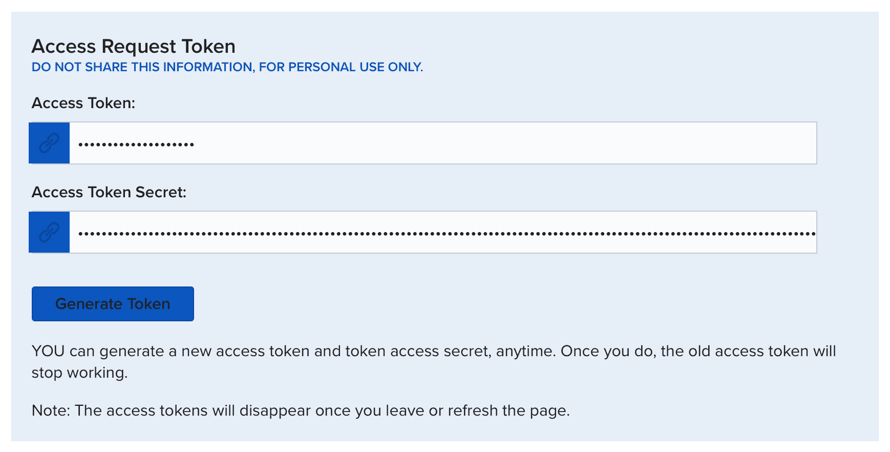 And finally press "Generate Tokens" in blue Access tokens section