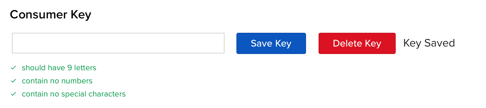 openssl rand -base64 12 | tr -dc 'A-Za-z' | head -c 9Once you pasted consumer key, press "Save Key" blue button